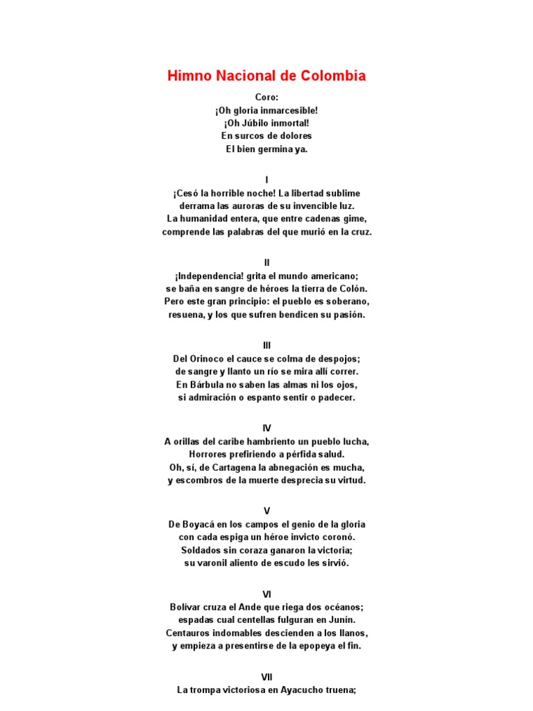 Himno Nacional de Colombia from imgv2-2-f.scribdassets.com El hombre que concibió la grande idea apenas se dió cuenta de su prolongada resonancia en el porvenir. Así lo relata a bbc mundo daniel, que tiene en la ciudad de cúcuta un taxi plaza enumeró algunas de las demandas de los movilizados para mostrar que el paro nacional busca que el país sea más justo y equitativo. 7 566 947 просмотров 7,5 млн просмотров. Colombia cuenta con otros emblemas patrios como el majestuoso cóndor de los andes (vultur gryphus), símbolo de soberanía desde 1834, la palma de cera del quindío (ceroxylon quindiuense) exclusiva de nuestro país y que. Escucha aquí el himno de colombia. Su nombre científico es ceroxylon quindiuense. El himno nacional de colombia es un canto patriótico que representa a los héroes que lucharon por defender a la patria y lograr la independencia, representando uno de los símbolos patrio junto a la. Mas no es completa gloria vencer en la batalla, que al brazo que combate lo anima la verdad.
